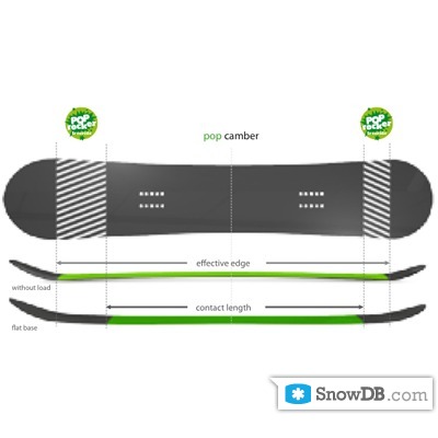 It combines the benefits of rocker technology with the pop of a traditional cambered board. The longer rocker area in the nose increases float in pow, without sacrificing pop. No matter whether dropping a pillow line or sticking a huge cliff you float in anything. Long rockered nose for unbelievable floatation; Camber between your feet for enough power; Short rockered tail to land big drops.